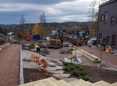 Vi utførte for grunnarbeidene for tomt til bygg, omlegging av VA og strøm og parkeringsplass. Utenomhus arbeidene omfattet etablering av lekeområder med armert gress, beplantning, legging av støtdekker og levering og montering av lekeapparater.